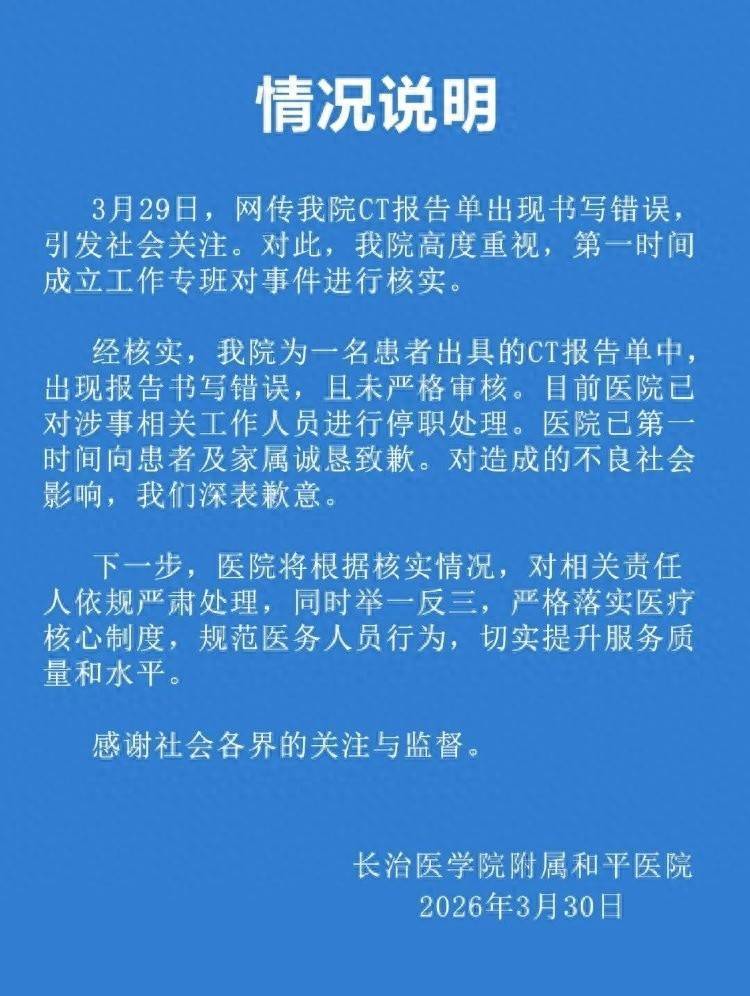 经核实,医院为一名患者出具的CT报告单中出现报告书写错误,且未严格审核。目前医院已对涉事相关工作人员进行停职处理。医院已第一时间向患者及家属诚恳致歉。对造成的不良社会影响,医院深表歉意。