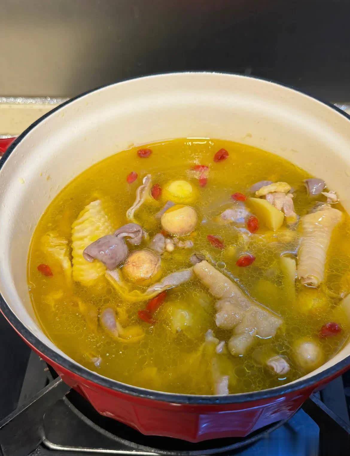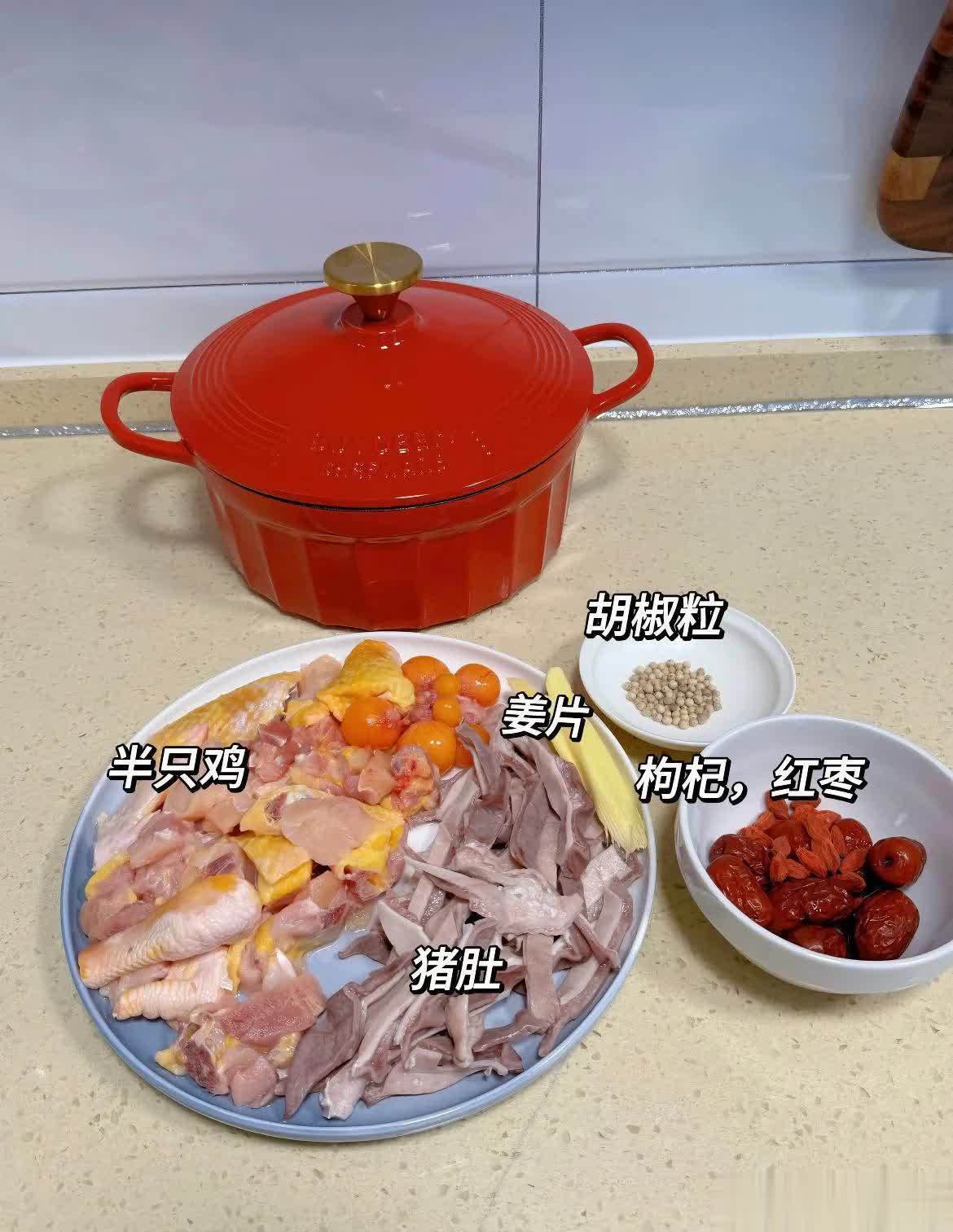 食材:鸡、猪肚、红枣、枸杞、姜片、胡椒粒