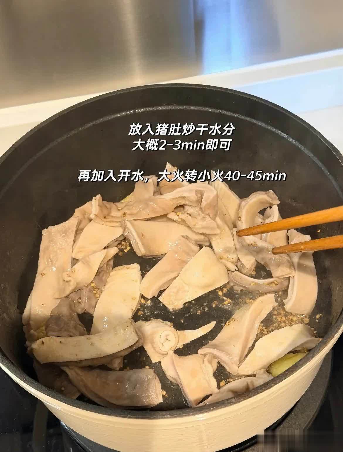 3. 另起锅放油,姜和花椒炒一两分钟,下猪肚翻炒,倒开水,一定要开水。
