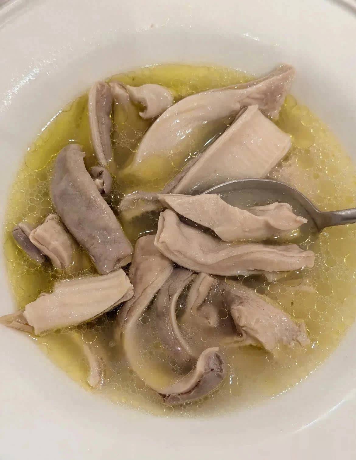 1. 猪肚用盐、生粉、醋反复搓洗三四遍,反过来继续搓,黄色和油的地方剪掉。最后再洗一遍,泡20分钟。