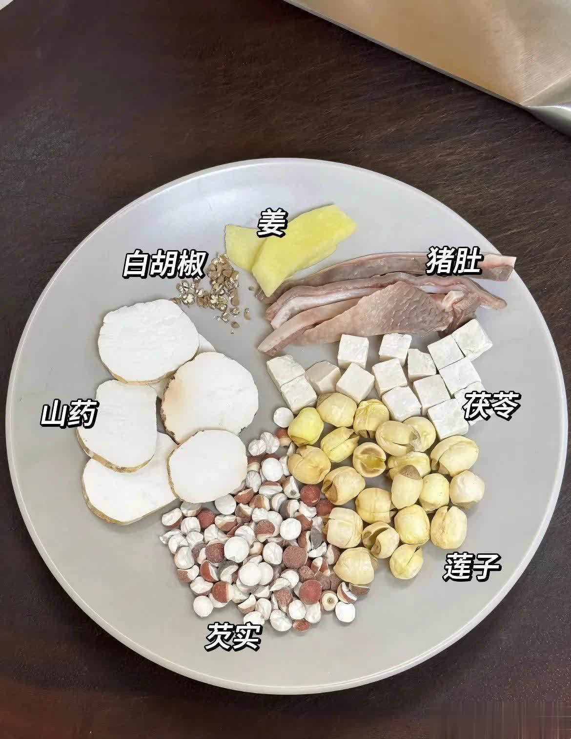 食材:山药20克、芡实20克、莲子20克、茯苓20克、猪肚250克、姜片、白胡椒几粒