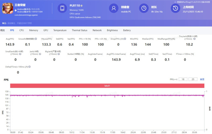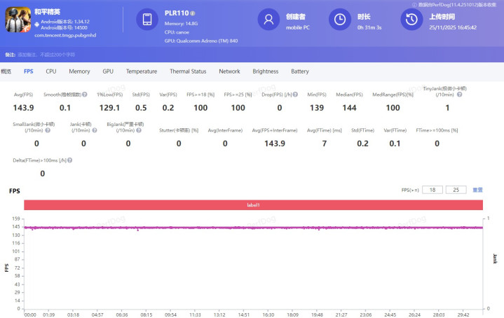 我们也测试了另一款同样适配144帧画面的《和平精英》,半小时游戏结束后平均帧率也高达143.9帧,1%Low帧达到了129.1帧,这意味着在游戏中的跑毒、刚枪等关键场景,一加 Ace 6T的操作响应会更迅捷,画面表现更流畅,不会因为帧率波动而影响操作的体验。