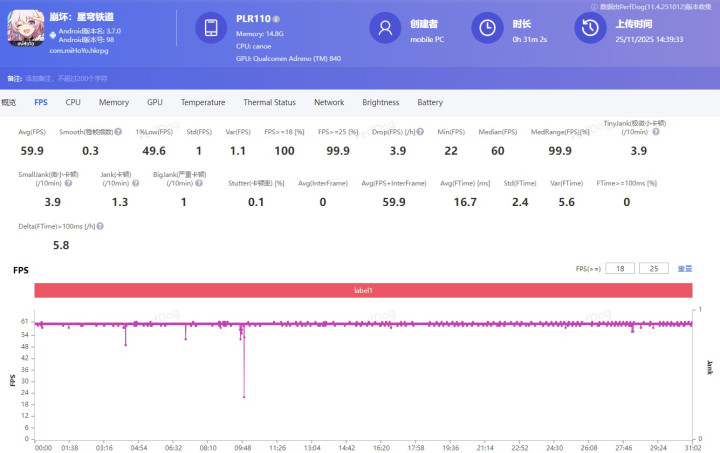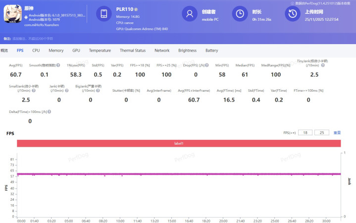 《原神》开启最高画质+60帧模式,在须弥新地图连续跑图半小时后,平均帧率 60.7帧,测试全程没有出现一次掉帧。平均功耗也仅为3.5W,机身最高温度为38.4℃。