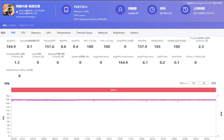 而同样支持165Hz的《穿越火线》手游,游玩半小时后的平均帧率来到了164.9帧,平均功耗3.8W,机身最高温度仅为38.2℃。可以看到不论是帧率、功耗还是发热,一加 Ace 6T依旧延续了无限满帧的出色游戏体验。