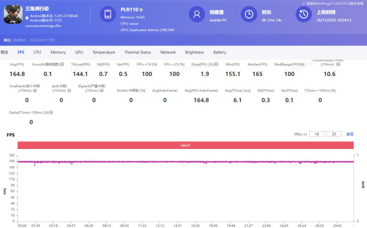 经过我们的实测,运行半小时165帧的《三角洲行动》平均帧率达到了164.8帧,从帧率图大家也能感受到,完完全全就是在满帧运行游戏。测试平均功耗为4.4W,而机身最高温度仅为39.4℃,这个发热对于握持的影响基本可以忽略不计。体验165帧游戏的直观感受就是,搜集物资、开镜扫射、撤退奔跑等一系列操作响应更快更迅捷,且游戏画面几乎没有拖影。