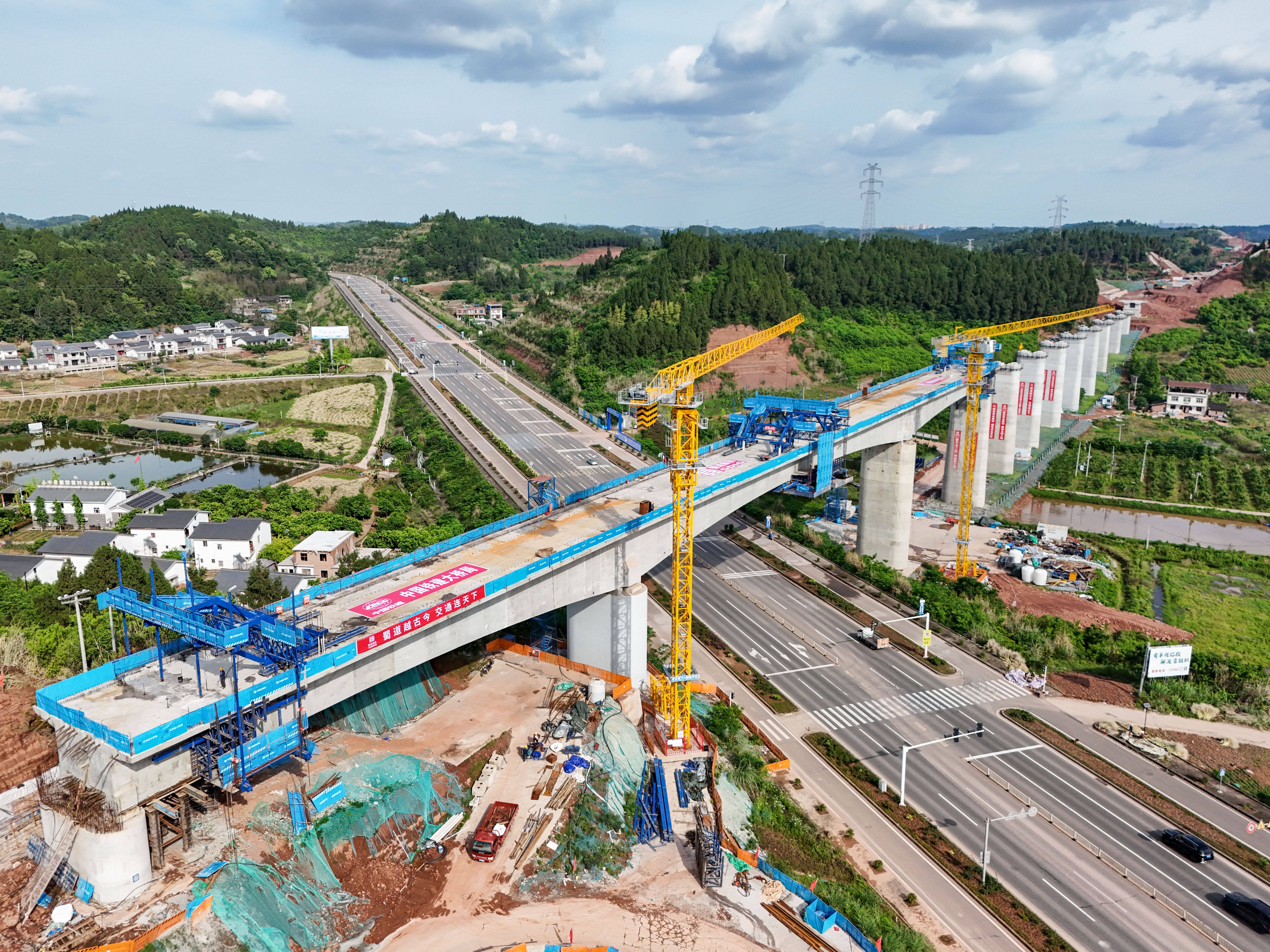 蒋家沟特大桥全长560.55米,主跨以连续梁形式上跨遂宁至大英快速通道。桥位地处交通要道,涉路施工安全风险高、连续梁线形控制精度严、工序衔接要求高,是全线建设的重点与难点。