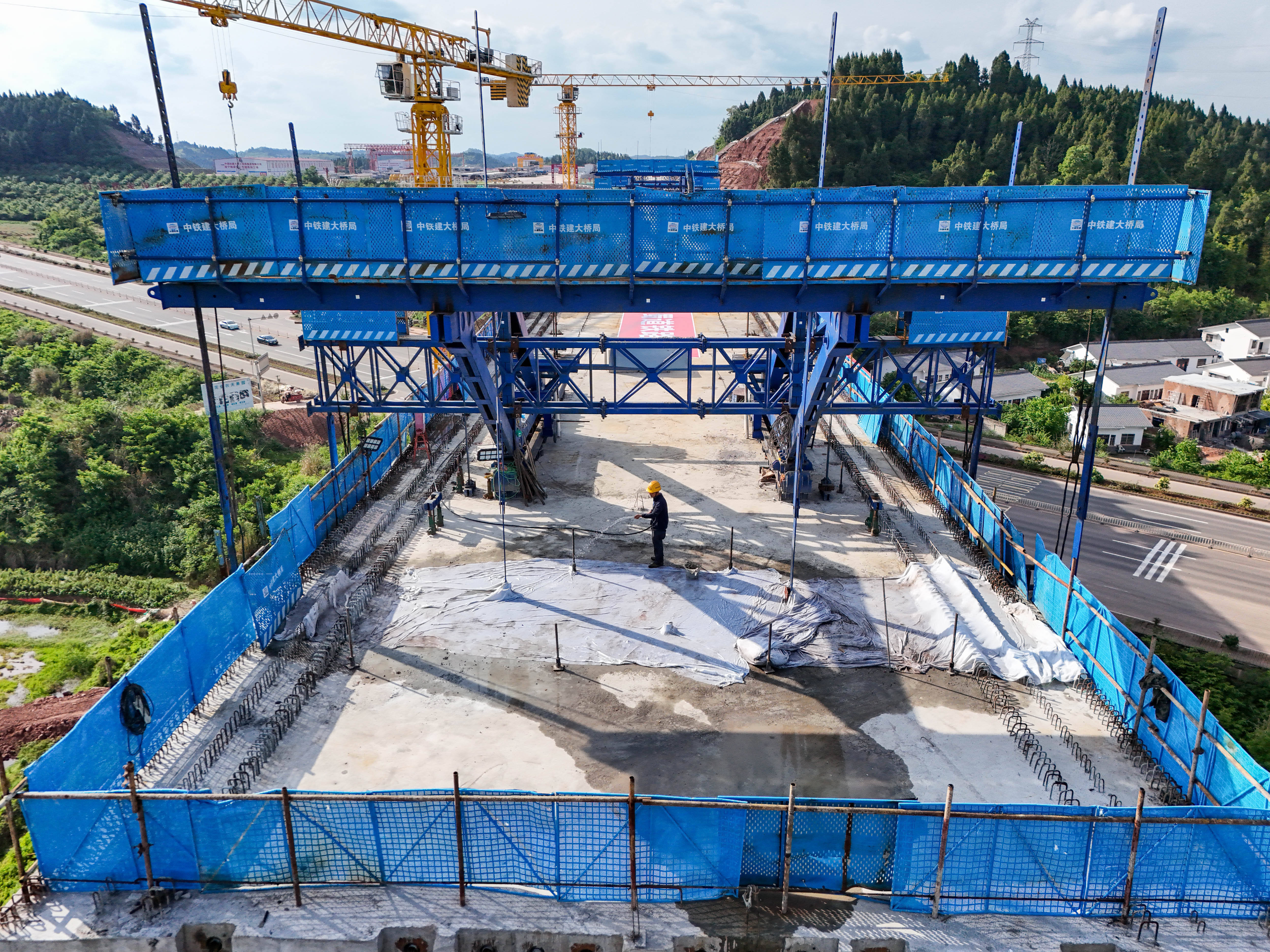 在绵遂资内铁路蒋家沟特大桥建设现场,工人正进行桥面养护。新华社记者 王曦 摄同时,项目团队积极应用绿色施工技术,将废旧混凝土试块二次加工为挂篮预压配重块,实现废料资源最大化利用;使用智能张拉设备实现一键控制、数据实时采集与自动校核;推行墩身模板与作业平台一体化工艺,以外挂式平台和定型防护栏杆提升高空作业本质安全水平。